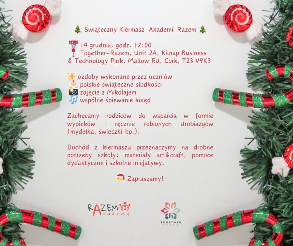 Już 14 grudnia 2025 r. od godz. 12:00 spotykamy się w biurze Together-Razem w Cork, aby wspólnie poczuć świąteczną atmosferę i wesprzeć naszą szkołę.